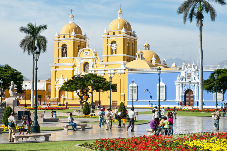 Día 05: Excursión Chan-Chan & Huaca del Sol y La Luna Noche en Trujillo Excursión a la ciudad de barro más grande del mundo CHAN-CHAN cuya extensión es de 20 km2. Sus paredes están decoradas con frisos estilizados en alto relieve con figuras zoomorfas y geométricas. Apreciaremos sus plazas ceremoniales, adoratorios, calles, reservorios y graneros, etc. Fue la capital del IMPERI CHIMU, albergo a 50,000 mil personas. Visita a la Caleta de pescadores Huanchaco. Por la tarde visitaremos las pirámides del SOL y de La LUNA, construida en 6 Plataformas, sus paredes están ornamentadas con hermosos arabescos con motivos de la mitología Mochica.Después disfrutaremos de la variada artesanía local hechos por la manos de los descendientes mochicas. Retorno al hotel.